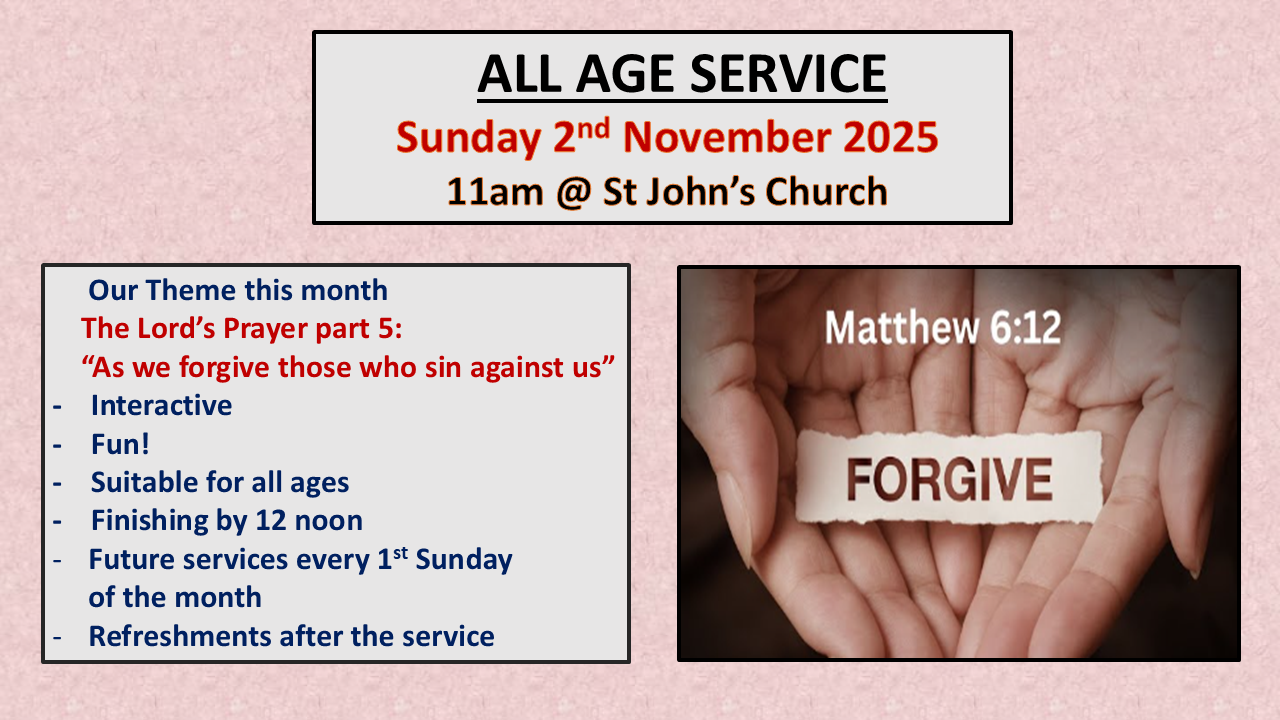Our next All Age Service is on Sunday 2nd November 2025 11am at St John's Church This month’s theme is:- "The Lord’s Prayer part 5: As we forgive those who…