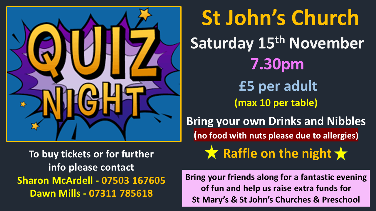 Please join us for a fun Quiz Night to raise funds for our Parish Churches and Preschool Date - Saturday 15th November Time - Arrive from 7pm, Quiz will start…